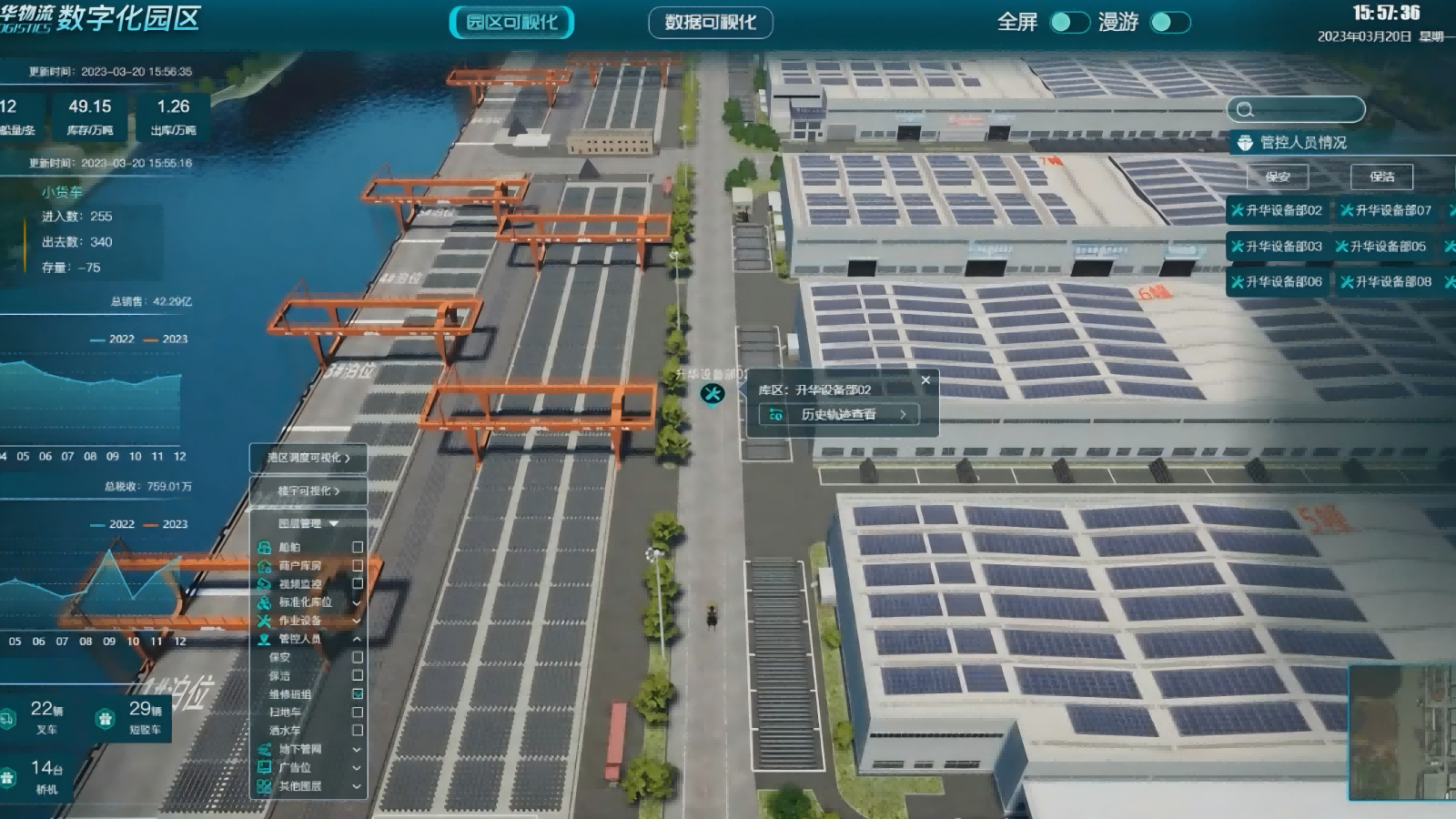 在数字园区中,系统将原本分散在不同系统中的仓库管理与作业信息进行统一承载,通过空间化方式呈现各仓库状态、物料分布及通行条件,帮助管理人员快速识别影响通行与作业效率的关键节点。结合对河道通行情况与场内堆料状态的直观展示,为园区调度与资源配置提供清晰参考。