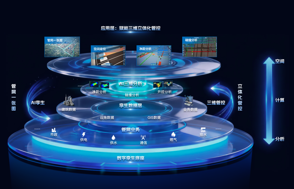 数峦云城市管网数字孪生解决方案融合三维 GIS、BIM、IoT 技术构建一体化三维数字底座,整合电力、通信、给排水等全类别管线数据,具备高精度建模、实时监测预警、风险识别等核心能力。其打通规划、建设、运维、应急全业务链路,通过模块化部署适配多场景,服务多部门协同管理。最终助力提升地下空间治理效率与城市运行安全,支撑智慧城市建设。