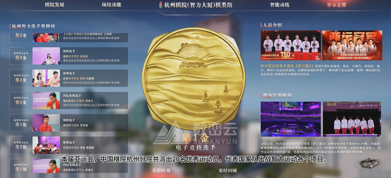 作为亚运核心场馆,杭州棋院见证 13 枚亚运金牌的诞生以及本地选手“五金二银”的拼搏历程。我们也将过往赛事的精彩瞬间转化为可触碰、可聆听、可回味的鲜活体验,通过情感化的交互设计,激发公众对智力运动的热爱与对亚运精神的共鸣。